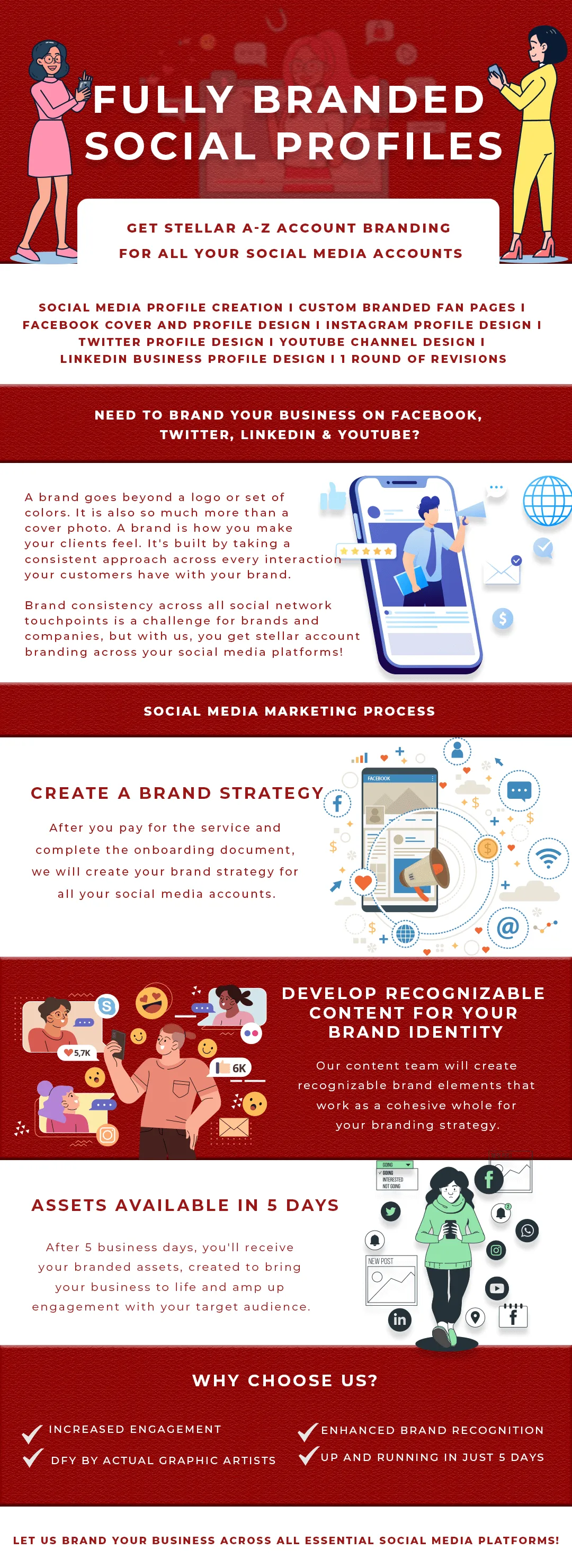 We take care of your A-Z account branding for your Facebook, Instagram, Twitter, Youtube, Linkedin cover pages, and profile image.