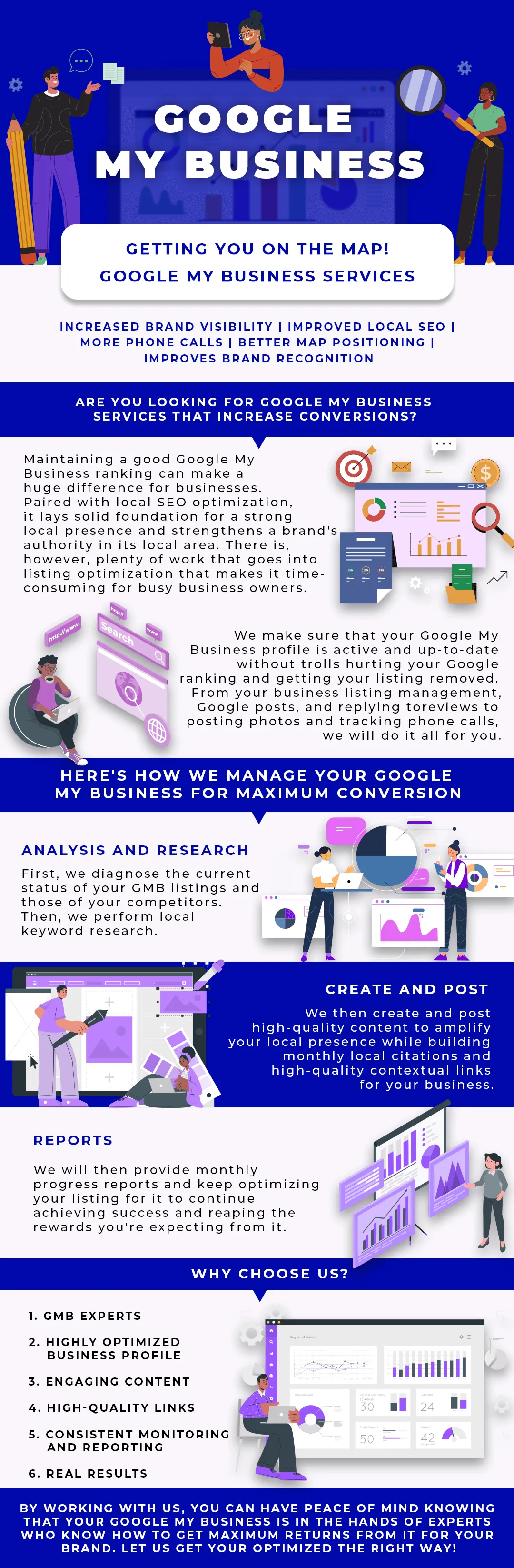 - Optimizing a Google My Business account is heavy on the content side. Our content team creates unique posts that are geo-tagged and posted on your GMB account.
